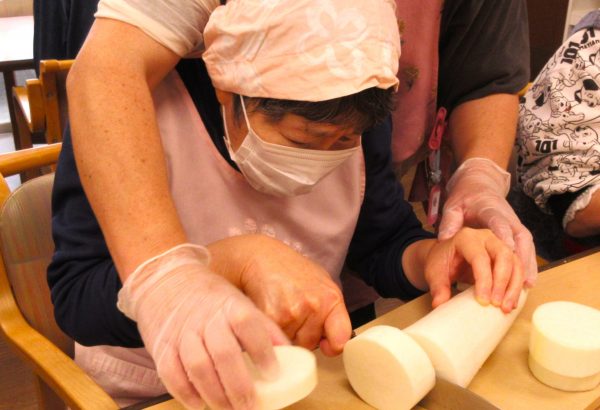 障害者週間のイベントとしておでんを作りました。 立派な大根を一緒に切ります。 みんなで食