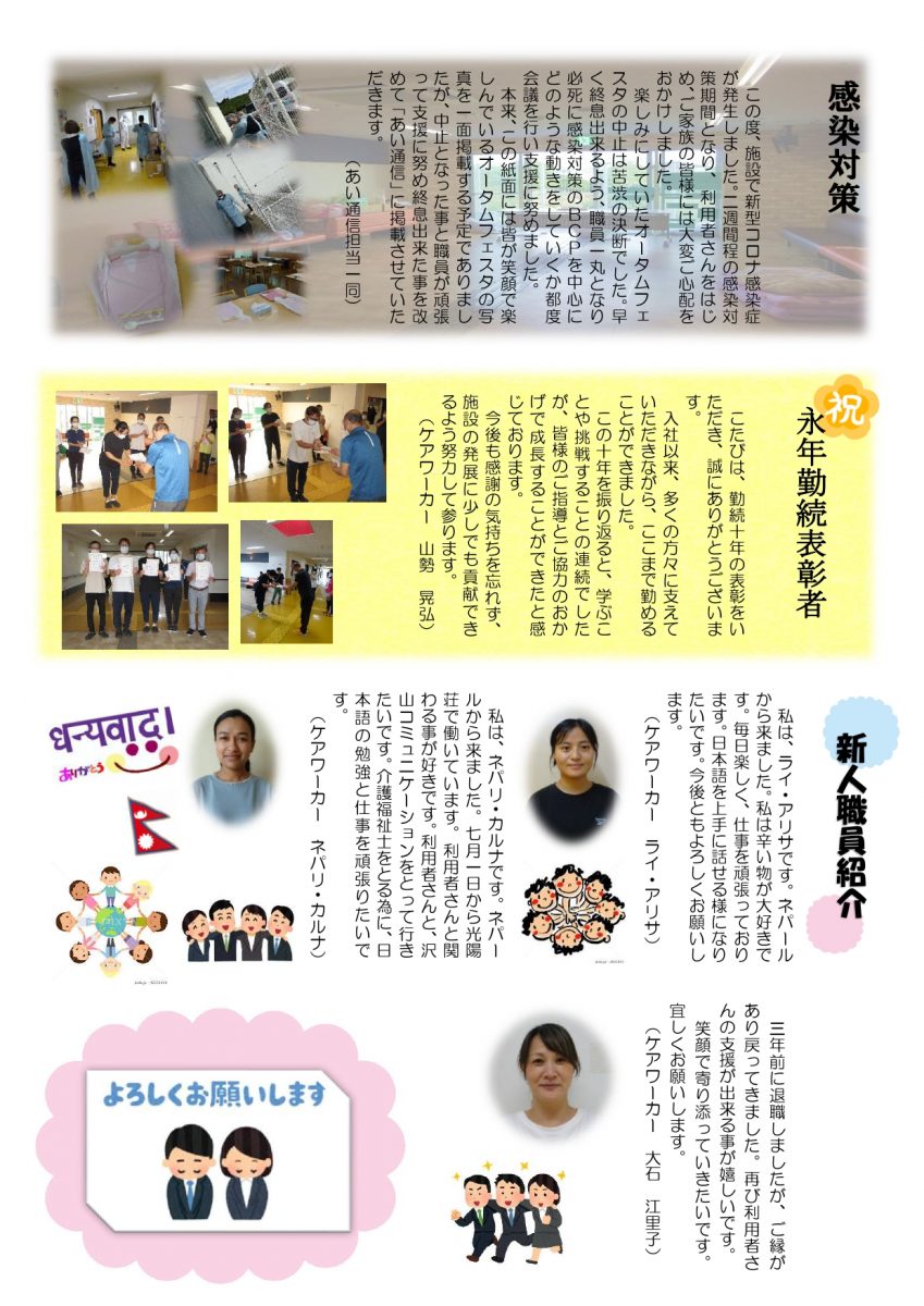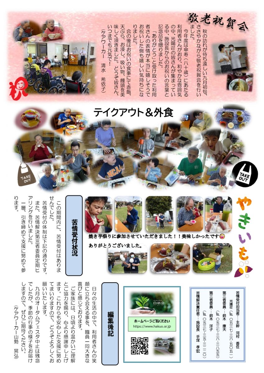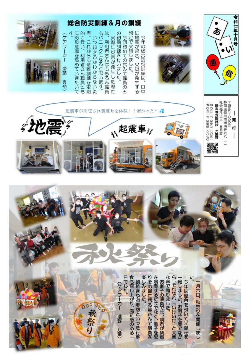 光陽荘-あい通信2025年10月号です。久しぶりの投稿となります。コロナウィルス感染症が今年も流行ってしまい、楽しみにしていたオータムフェスタが苦渋の決断で中止となった事は残念でした。なので…それ以外の行事や活動を多く掲載しています。是非、ご覧下さい。